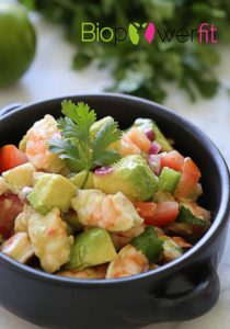 💡El jugo de lima y el cilantro son los ingredientes clave para crear esta ensalada maravillosa y saludable que querrás hacer durante todo el verano. Hecho con camarones pelados y los ingredientes más frescos – aguacates, tomates, cebolla roja, cilantro y jalapeño picado con un poco de jugo de limón recién exprimido y un toque de aceite de oliva.